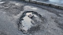 Pothole,Filled,With,Water,And,Debris,On,Urban,Road,After